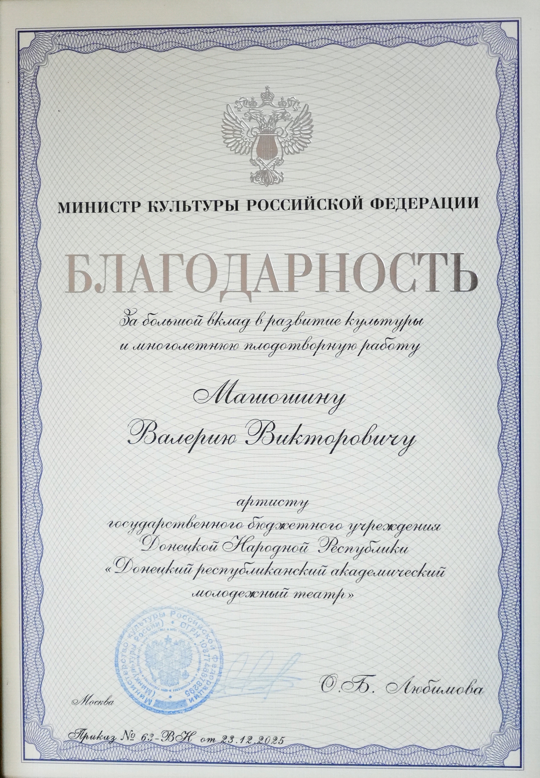 За вклад в развитие культуры Благодарность Министра культуры Российской Федерации вручена артисту Донецкого РАМТа Валерию Машошину!